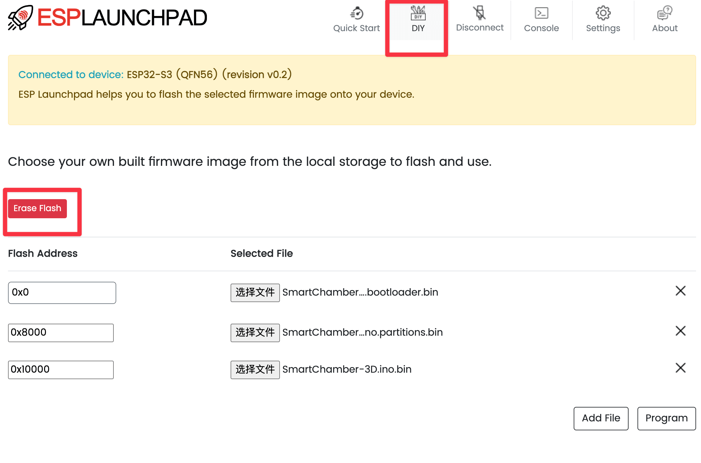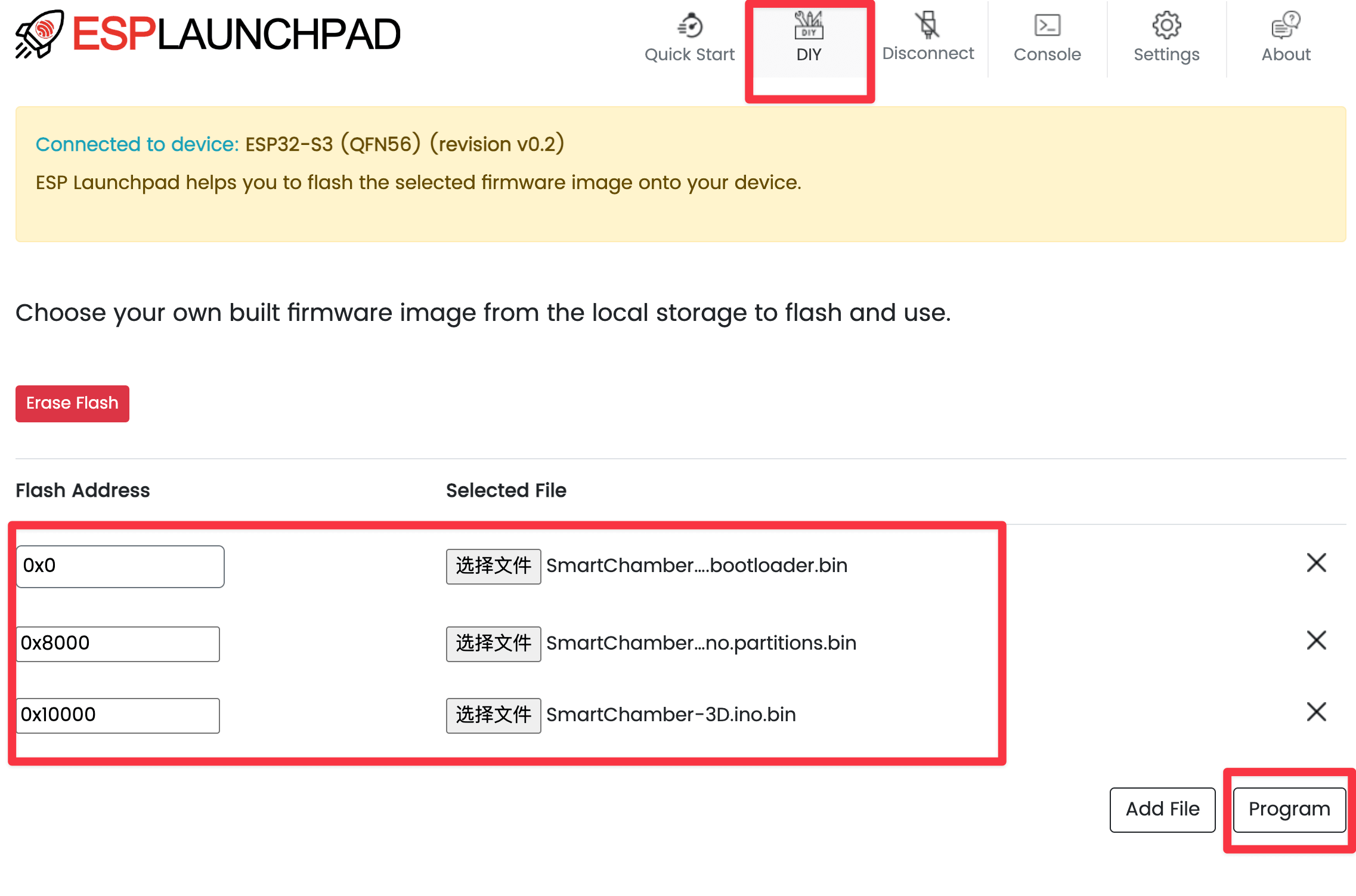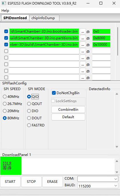 File Address C:\XXX\SmartChamber-3D.bootloader.bin 0x0 C:\XXX\SmartChamber-3D.partitions.bin 0x8000 C:\XXX\SmartChamber-3D.ino.bin 0x10000 Configure additional parameters: